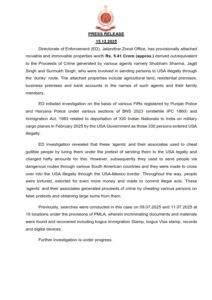 जालंधर (रोजाना भास्कर न्यूज): प्रवर्तन निदेशालय (ED) के जालंधर जोनल ऑफिस ने 15 दिसंबर 2025 को मनी लॉन्ड्रिंग रोकथाम अधिनियम (PMLA), 2002 के तहत बड़ी कार्रवाई की है। ED ने अमेरिका में अवैध इमिग्रेशन (डंकी रूट) से जुड़े मामले में करीब 5.41 करोड़ रुपये की चल व अचल संपत्तियों को अस्थायी रूप से अटैच किया है।