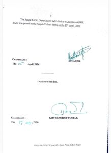 चंडीगढ़/जालंधर, रोजाना भास्कर ब्यूरो: पंजाब में धार्मिक आस्था से जुड़े मामलों पर सख्त रुख अपनाते हुए राज्यपाल Gulab Chand Kataria ने ‘जागत ज्योति श्री गुरु ग्रंथ साहिब सत्कार (संशोधन) विधेयक-2026’ को अपनी मंजूरी दे दी है।