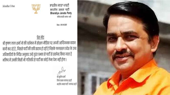 जालंधर, रोजाना भास्कर (हरीश शर्मा): भारतीय जनता पार्टी (भाजपा) ने जालंधर के स्थानीय नेता किशन लाल शर्मा को पार्टी से सोशल मीडिया पर आपत्तिजनक बयानबाजी करने के आरोप में निष्कासित कर दिया है। पार्टी हाईकमान ने मामले का संज्ञान लेते हुए तुरंत प्रभाव से कार्रवाई की और इस संबंध में आधिकारिक पत्र जारी किया।