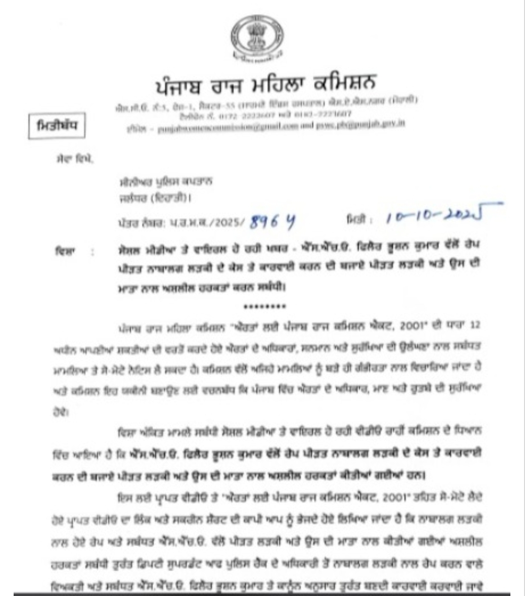 आयोग ने सोशल मीडिया पर वायरल वीडियो का संज्ञान लेते हुए कहा है कि एसएचओ भूषण कुमार ने पीड़िता के मामले में कार्रवाई करने की बजाय अनुचित व्यवहार किया। आयोग ने एसएसपी को भेजे गए पत्र में वीडियो लिंक और स्क्रीनशॉट भी शामिल किए हैं।